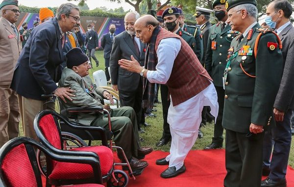 Dec 14: Raksha Mantri Shri Rajnath Singh interacted with Indian war veterans and Mukti Jodhas of Bangladesh in New Delhi on December 14, 2021, as part of Swarnim Vijay Varsh celebrations, marking 50 years of India’s historic victory in the 1971 war. The gathering comprised of 30 Mukti Jodhas, families of all four Param Vir Chakra and other awardees as well as war veterans. The Mukti Jodhas have been invited to participate in Swarnim Vijay Varsh events to honour the bravehearts who took part in the 1971 war. In his address, Shri Rajnath Singh paid rich tributes to the brave soldiers, sailors and air warriors who ensured the victory in 1971 war by making supreme sacrifice while displaying devotion to duty.