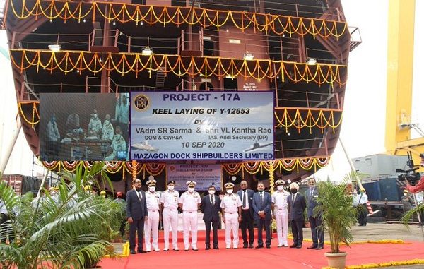 Sep 10: Vice Admiral SR Sarma – COM & CWP&A of the Indian Navy and Shri V L Kantha Rao Additional Secretary (Defence Production) laid the keel of the third ship (Yard- 12653) of the prestigious P17A class stealth frigates on 10 Sep 2020. The keel-laying ceremony was conducted through an e-platform in the presence of Vice-Admiral R B Pandit, Chief of Staff, HQWNC, and Vice Admiral Narayan Prasad (IN Retd.) – CMD MDL.