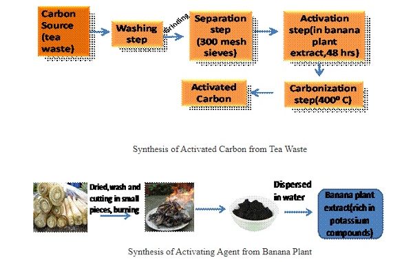 Oxygenated potassium compounds contained in the banana plant extract help in activating the carbon prepared from tea waste. An Indian patent has recently been granted for this.