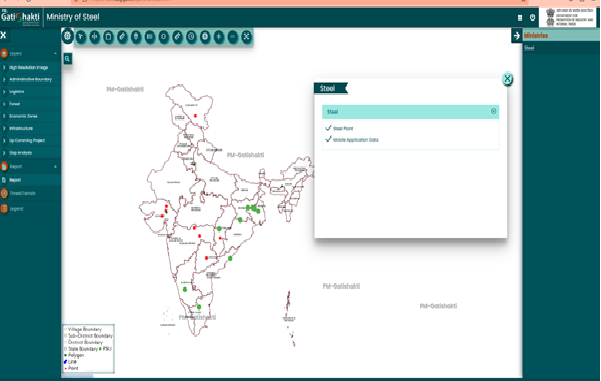 Jun 28: The Ministry of Steel has onboarded itself on the PM GatiShakti Portal (National Master Plan portal) with the help of Bhaskaracharya National Institute for Space Applications and Geo-informatics (BiSAG-N). It has created its first layer of data by uploading Geo locations of all the steel plants of CPSEs under the administrative control of the Ministry of Steel. The Geolocation of all the mines of these CPSEs under the administrative control of the Ministry of Steel is also in the process of being uploaded.